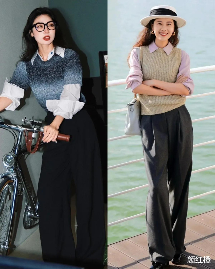 例如下面这两套穿衣打扮选择了针织背心,叠穿一件不同颜色的衬衫,再加上灰色的长裤或者是灰色阔腿裤,不同的颜色穿搭形成了一个装饰的效果,让整个造型层次感更分明显得更加的洋气。