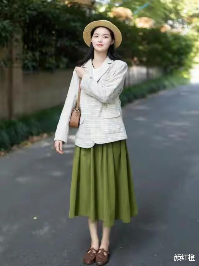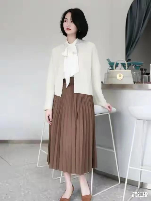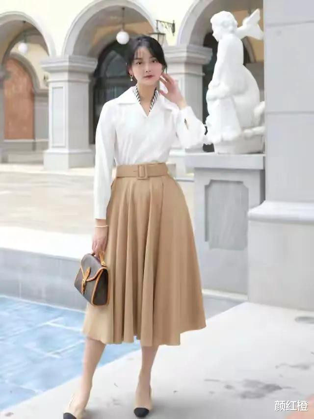 如果你是在南方城市的话,我们可以直接选择单穿的方法,直接向下面这位达人一样,用一件最为基础的白色衬衫搭配上卡其色的高腰收腰款散装半身裙,脚踩一双拼接色的高跟鞋,这一身穿衣造型经典耐看,普通大众穿的都很好看。