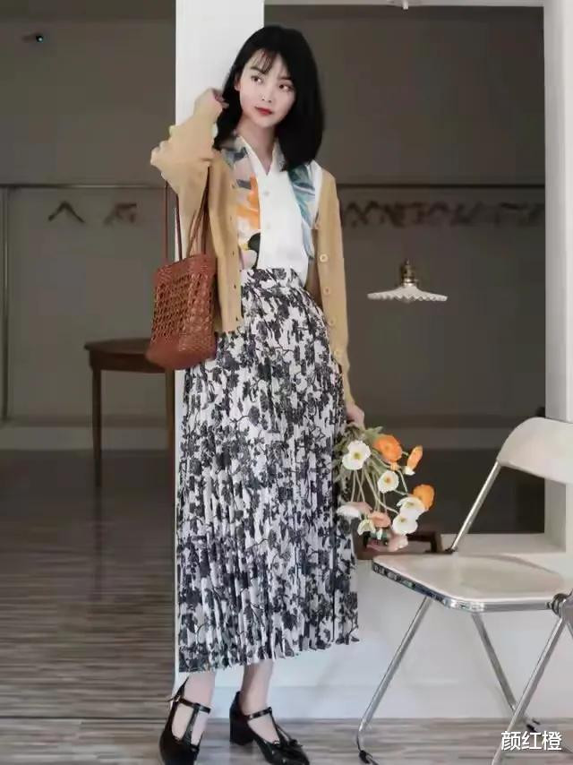 想要温柔感的情况下,我们选择针织背心作为外搭,叠穿白色衬衫或者是印花衬衫,再加上半身裙,脚踩一双红色的浅口粗跟单鞋就够了。
