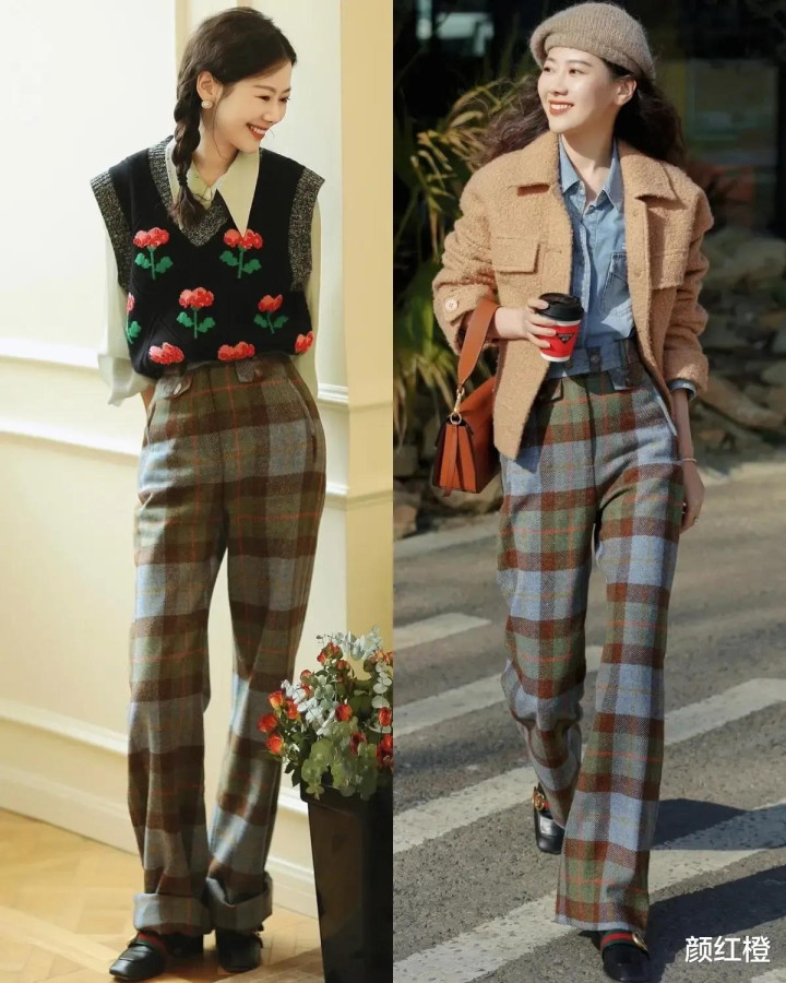 当然,除了搭配裙子之外,我们还可以选择裤子来穿搭,例如下面这两套穿衣造型就选择了格纹的长裤,搭配上不同款式的衬衫或者是外套,整体的效果很时髦,穿去上班再适合不过了。