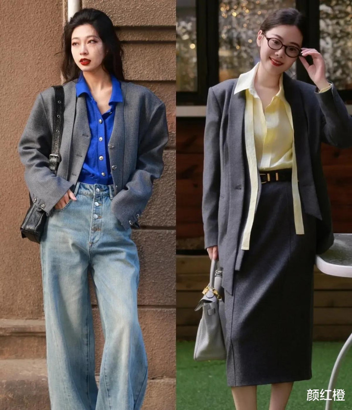 其实,对于职场女性来说,选择西服来穿搭最为合适,不过千万不要选择黑色的西服外套,选择最为基础的灰色西服比较休闲洋气,也不会过于死板里面,可以内搭蓝色衬衫或者是黄色衬衫都可以,再加上牛仔裤,整套穿造型会更洋气。