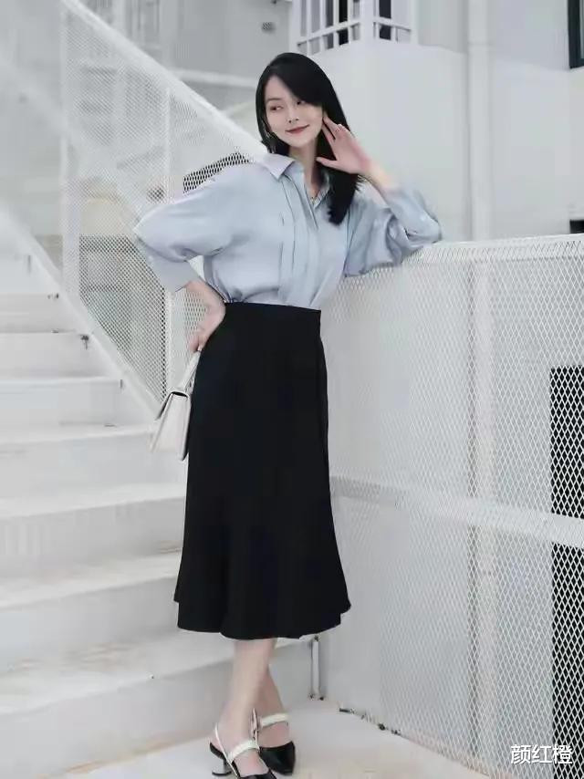 如果身材管理很不错的情况下,还可以选择一件浅蓝色的衬衫搭配上高腰小腰款的鱼尾半身裙,脚踩一双穆勒鞋,这一身穿衣打扮看起来会比较稍微正式感一点,但也不会过于死板。
