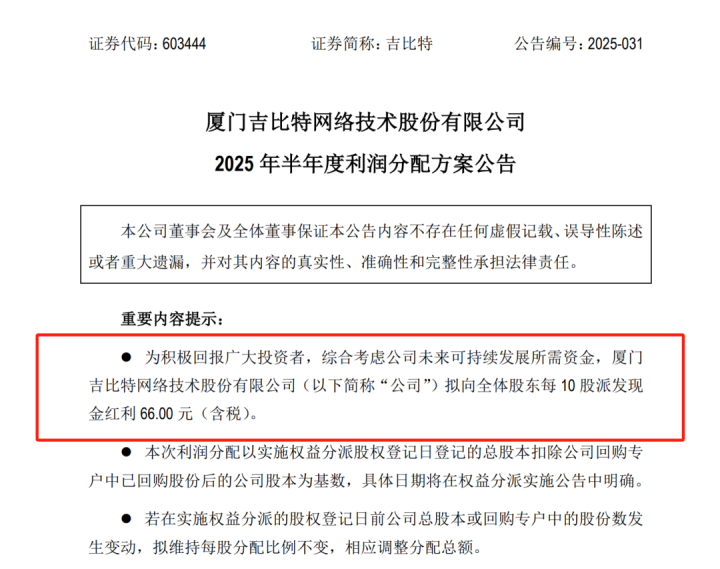 A股“分红大户”吉比特(证券代码:603444)再次推出豪气分红方案。公司8月19日晚间公告,拟向全体股东每10股派发现金红利66.00元(含税)。