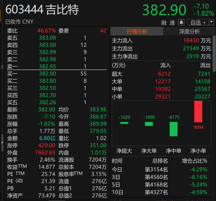 8月19日,吉比特收报382.90元/股,总市值达276亿元。